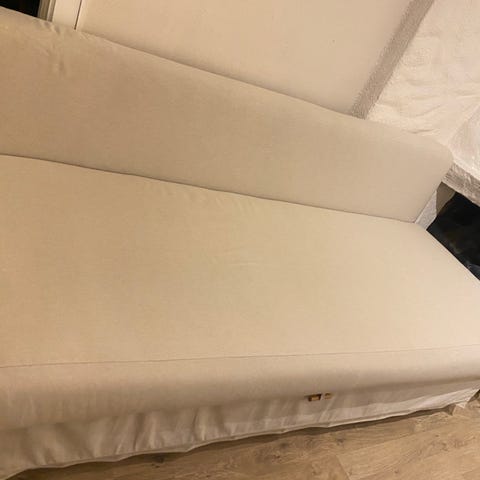 Selger sovesofa ettersom jeg ikke trenger den lenger. Den ble kjøpt ny hos IKEA i midten av Oktober 2025 for 3495kr. Det er lagringsplass på innsiden av den som kan brukes til f.eks sofaputer, dyne, osv. Lagringsplass vises på bilder 3-6. Den er pent brukt. Kan splittes i 2 deler som vist på bilde 8, 9 og 10. Mål på bilde 11. Selges for 2500kr, men pris kan diskuteres ved rask henting. Bruksanvisning følger med. Hentes hos de nye SiO studentboligene i Nydalen. Bor i 4. etasje og heis er tilgjengelig.