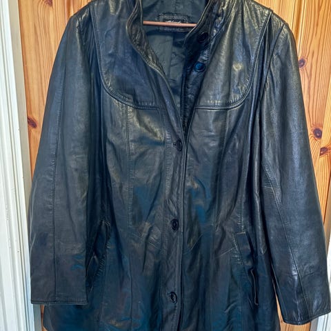 Aleksander of Norway skinnjakke for dame i størrelse M. Jakken er i svart skinn med enkel, rett fasong. Passer fin som pent blazer .