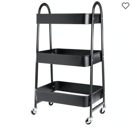 Hyller på hjul. Øverste hylla mangler original skrue. Men har brukt en annen skrue, som funker fint.