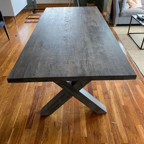 Jeg selger et svært unikt og pent spisebord, håndlaget av en møbelsnekker etter våre spesifikke mål og ønsker. Bordplaten er laget av massivt treverk med opprinnelse fra flere hundre år gammel regnskog. Detaljene er særegne, og langs kantene finnes autentiske spor etter øks fra den opprinnelige hogsten, noe som gir bordet en helt spesiell karakter og historie. Understellet er håndsveiset, solid og stilrent. Bordet har god plass til opptil 10 personer.