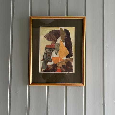 Sonja Schartum innrammet akvarell med abstrakt landskapsmotiv i grønne, rosa og jordfargede toner. Bildet er signert og datert nede i høyre hjørne. Akvarellen er montert med passepartout og rammet inn i en enkel, lys ramme med glass. Ramme mål: 50x40,5 cm. Kan sendes med Fiks Ferdig eller hentes på Lilleaker. Noe slitasje på rammen ellers i god stand.