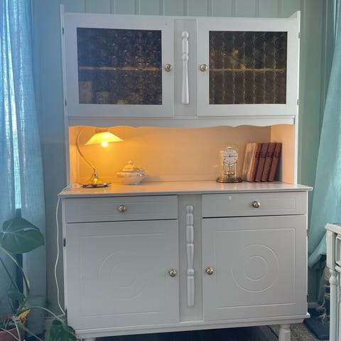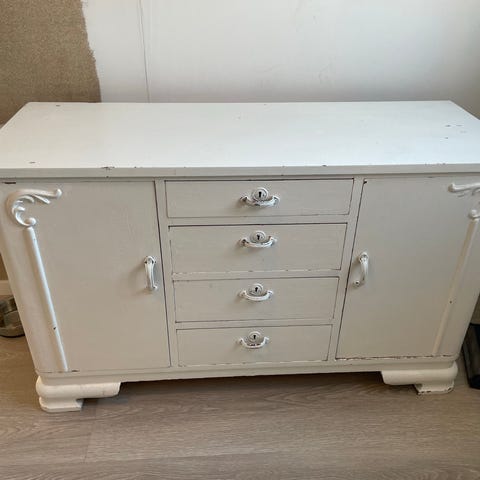 Gammelt " hjemmesnekret " skap . Vet ikke hva skapet er tiltenkt som, med tanke på topplaten og det uttrekkbare hyllen. Sjarmerende og koselig skap. Det er helt og inntakt. Må hentes
