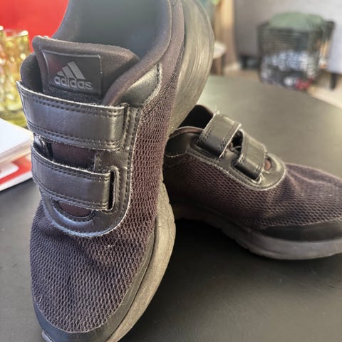 Adidas joggesko for barn, unisexmodell. Skoene ble brukt av et barn som innesko. Det finnes et lite gull flekk av maling på den ene( se bilde). Masse bruk igjen!!!!!!