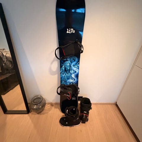 Selger et rått og gjennomført snowboard-oppsett bestående av: