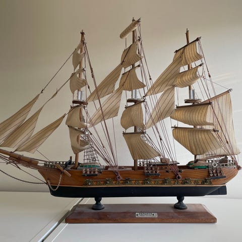Fragata Española 1780 modellskip i tre. Skipet er en detaljert modell av en spansk fregatt fra 1780, med flere master og seil i tekstil. Skroget er utført i tre med malte detaljer. Modellen står på en trebase med metallplate merket «Fragata Española 1780». Egner seg som dekorasjonsgjenstand eller samlerobjekt.
