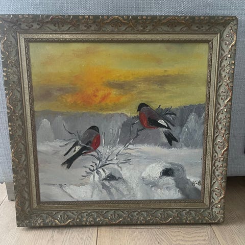 Sonja Schartum «Gul» kunstbilde collage i gultoner på akvarell. Bildet består av abstrakte former og lag med papir og fargefelter i hovedsakelig gule, grønne og brunlige nyanser. Verket er innrammet med passepartout og glass i en lys, smal ramme. Tittel «Gul» fremgår på etikett på baksiden sammen med kunstnerens navn. Var priset til 1500,-. Kan sendes med Fiks Ferfig eller hentes på Lilleaker. Rammemål 50x40,5 cm.