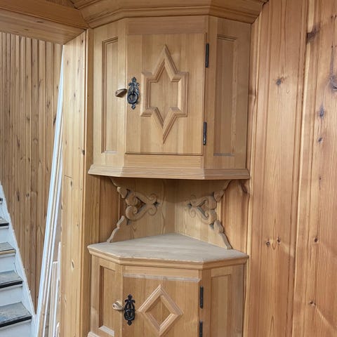 Selger et flott, eldre hjørneskap i heltre med nydelige utskjæringer og klassiske detaljer. Skapet har et tidløst uttrykk og passer perfekt i stue, hytte eller gang – spesielt i hjørner hvor man vil utnytte plassen smart. Skapet er ca. 185cm høyt.