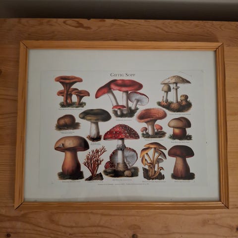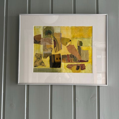 Sonja Schartum collage med ramme. Bildet består av en collage av revne papirbiter i ulike farger og motiver i grønne og oransje toner, montert på lys bakgrunn med akvarell i bunnen. Motivet har abstrakte former og figurative elementer. Verket er innrammet med passepartout i grønt og treramme med gull farge. På baksiden er det etikett med tittel og kunstnernavn, samt stempel fra Sæter Rammer i Oslo. Var priset til 1800,- rammemål 50x40,5 cm. Kan sendes med Fils Ferdig eller hentes på Lilleaker.