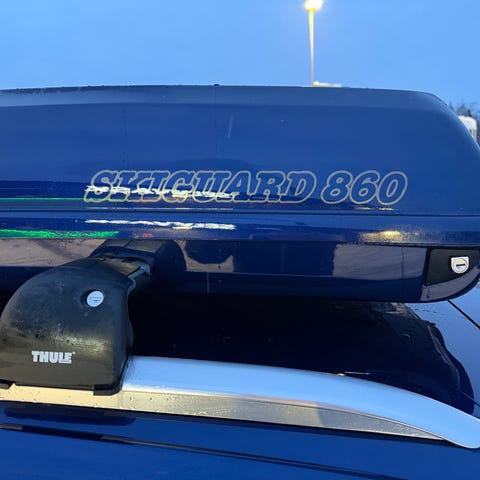 Hel og fin boks med Thule Wingbar stativ, stativet er tilpasset Porsche Taycan/ eller biler med åpne rails.