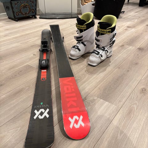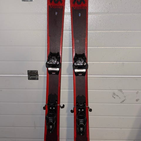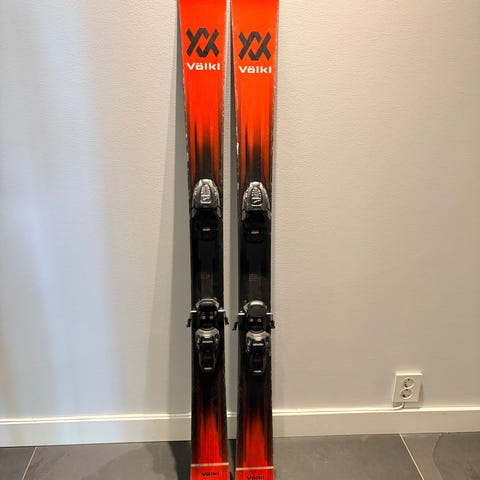 Völkl Mantra alpinski i lengde 177 cm. Skiene har rød topp og svart såle med Völkl-logo. Montert med Marker alpinbindinger. Modellen er en allmountain/frikjøringsski som egner seg til kjøring i preparerte løyper og variert terreng. Passer for voksne skiløpere, avhengig av høyde, vekt og ferdighetsnivå samt korrekt justering av bindingene.