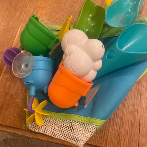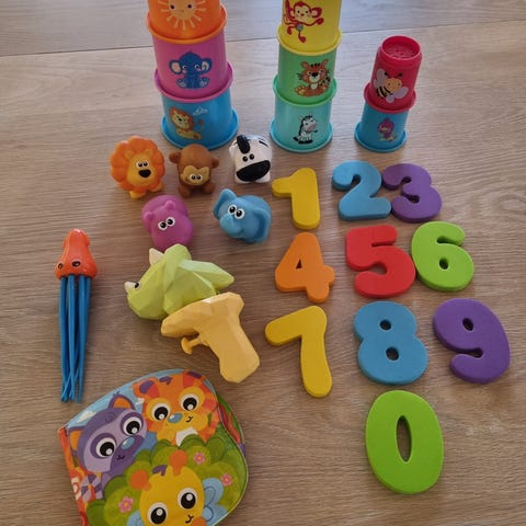 Badeleker med sugekopp som spinner når baby leker med dem. Kan henges i badekar eller dusj.