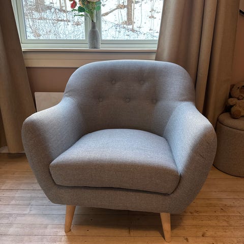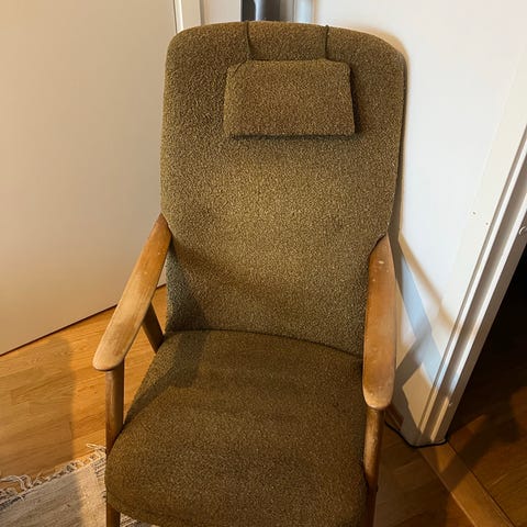 Selger en pent brukt lenestol i stofftrekk. Sete- og ryggputer i skum. Ben i massivt tre. B69 x H90 x D76 cm