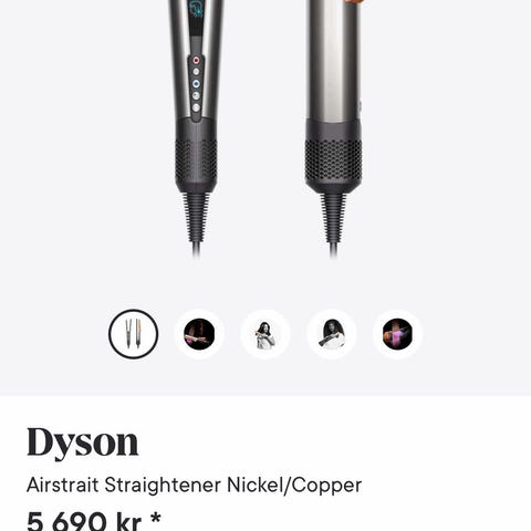 Dyson Airstrait styler hårstyler i fargen nikkel/kobber. Elektrisk hårstyler for retting og styling av hår. Leveres med strømledning, lader og oppbevaringsetui som vist på bildene. Egnet for bruk på ulike hårtyper til daglig styling og forming av frisyre.Brukt et par ganger.Fremstår som ny.Har kvittering.Oppbevaringspose følger med.