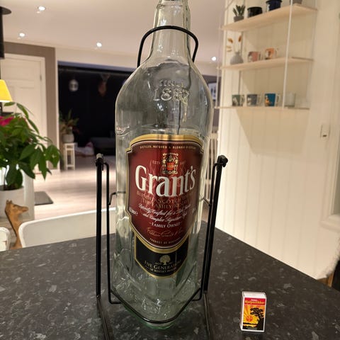 Grand Macnish mugge og diverse barutstyr. Inneholder en keramisk Grand Macnish Scotch Whisky-mugge i gul farge, flere helletuter/proppere med logoer som Beefeater Gin, Bacardi Rum og Ballantine’s Scotch Whisky, samt noen små tilbehør som rørepinner og små beholdere. Egnet som barutstyr eller som samleobjekter til hjemmebar eller samling av brennevinsrelaterte effekter.