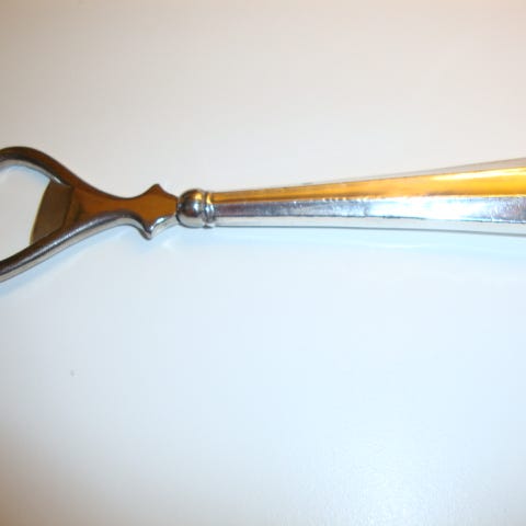 Flaskeåpner i rostfritt stål med dekorativt utformet håndtak. Håndtaket har et ornamentert mønster og klassisk form, og åpnerdelen er merket «Rostfri stål». Egnet til åpning av flasker med kapsel, for bruk på kjøkken eller i bar og serveringssammenheng.
