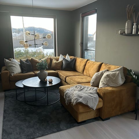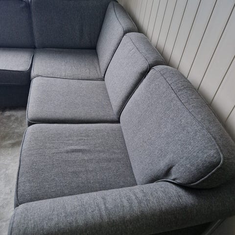 Med endeavslutning og sjeselong. den har stått i kjellerstue så er lite brukt. Kjøpt i 2021 på bohus.