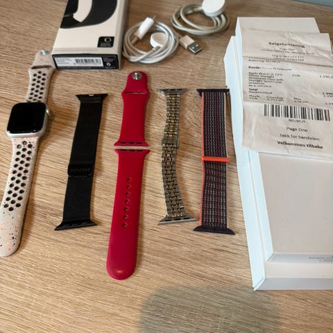 Apple Watch SE smartklokke 40 mm i rosegull. Klokken leveres med hele 6 utskiftbare remmer i ulike farger og materialer, inkludert silikonremmer og metallmesh-rem. Passer til daglig bruk, trening og varslinger fra iPhone. Støtter funksjoner som aktivitetsmåling, GPS, pulsmåling og varsler fra apper. Har noen små riper på skjerm.