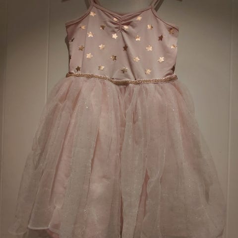 Barne kjole til jente i størrelse 122. Kjolen er blå med langermet overdel og flerlagsskjørt. Materiale i polyester. Egner seg som utkledningskjole eller til festlige anledninger for barn i aktuell størrelse.