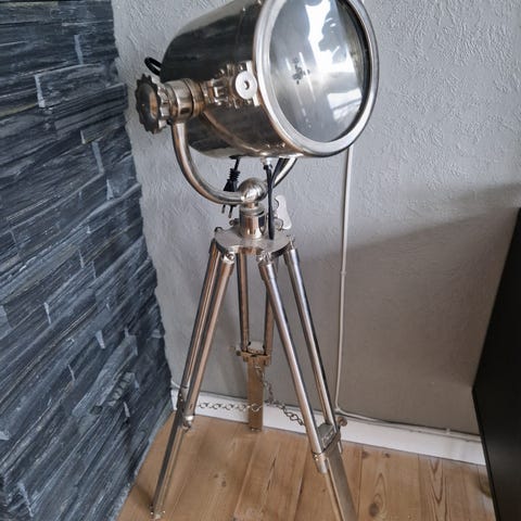 Tøff gulvlampe i industriell design trenger nytt hjem. Ca.150 cm høy, bein kan justeres slik at den kan bli lavere enn dette! (Nøytralt lys, har satt i en pære som gir gult lys på bildet) ingen skader, fremstår som helt ny