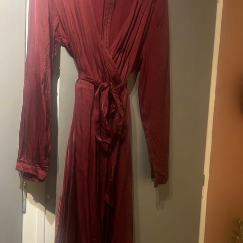 Anna Field festkjole i størrelse M for dame. Kjolen er rød og laget i polyester. Modellen har ermeløst snitt med omslagseffekt i overdelen og utsvingt skjørt. Lengden går omtrent til under kneet, se mål på bildene for mer nøyaktig passform. Ingen rivning eller merker.