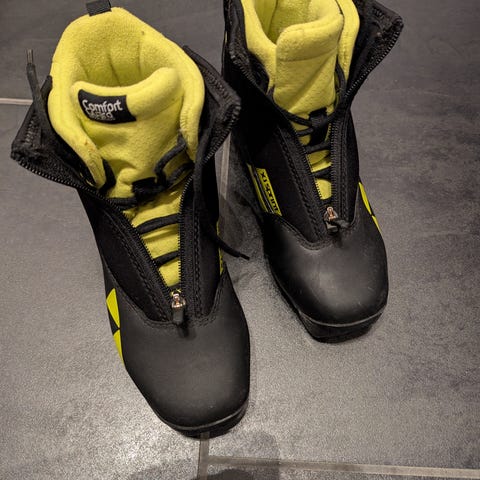 Fischer Ultimate langrennsstøvler i størrelse EU36. Modellen er i hovedsak svart med gule detaljer og polstret innside for økt komfort og varme. Overdelen er laget i syntetisk materiale med snøring foran og høy ankel for bedre støtte. Sålen er tilpasset moderne langrennsbindinger (se nærbilder for type). Egner seg til klassisk langrenn, for eksempel til barn eller mindre føtter som bruker størrelse 36.