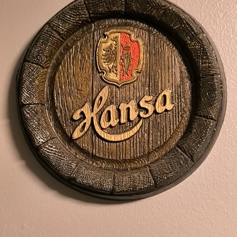 Ringnes veggklokke i rund utforming med romertall rundt kanten. Klokken har en brun front med Ringnes-logo i midten og dekorative detaljer. Den drives av et batteridrevet urverk montert på baksiden, og har oppheng for veggmontering. Egner seg som veggklokke i for eksempel kjøkken, stue, bar eller hobbyrom.