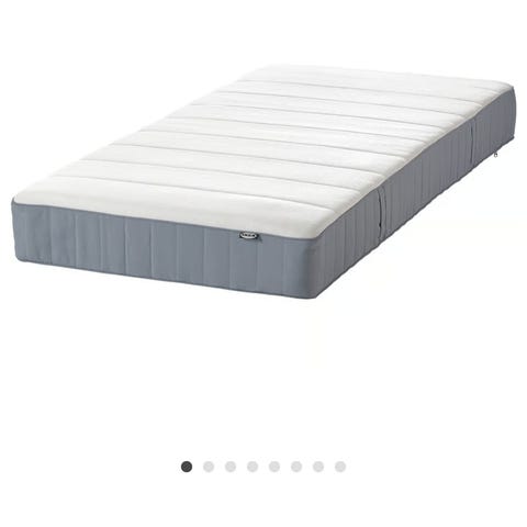 IKEA HAFSLO madrass for enkeltseng i hvit tekstiltrekk. Madrassen har quiltet overflate med langsgående sømmer. Egnet til bruk på enkeltseng eller dagseng, gjesterom eller barnerom. Standard rektangulær form og middels høyde. Kan brukes med vanlige laken til enkeltseng.
