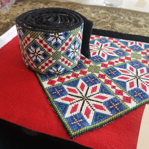 En hvit jærbunad som så vidt er påbegynt på lua. Inneholder stakk , sjal , lue, veske, garn , veiledning .
