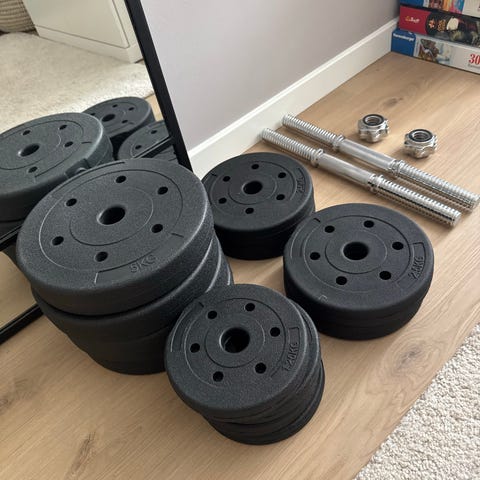 Vektene har tydelig rust og bruksspor, men er fullt funksjonelle. Selges billig nettopp av den grunn. Perfekt til hjemmetrening, kjeller eller bod.