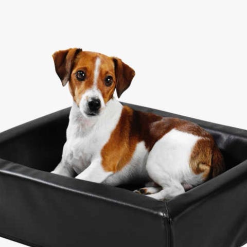 Rektangulær hundeseng i svart kunstskinn. Sengen har forhøyede kanter rundt og en senket liggedel i midten. Undersiden har strukturert overflate, så den ligger godt på gulvet! Egnet som liggeplass for hund, og kan plasseres på gulv eller i bur etter behov. Materialet er glatt og kan tørkes av ved rengjøring.