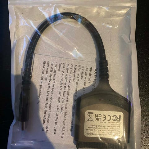 Nettverksadapter i hvit farge. Enheten har fastmontert kabel med kontakt i den ene enden og rektangulær modul i den andre. Passer til bruk der det er behov for kablet tilkobling mellom nettverksutstyr eller annet kompatibelt utstyr. Nøyaktig modell, spesifikasjoner og nettverkstype er ikke oppgitt.