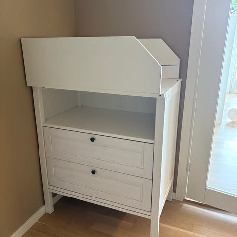 IKEA stellebord med kommode i hvit utførelse. Stellebordet har uttrekkbar stelleflate på toppen og åpen hylle under. Nederst er det to romslige skuffer med riflet bunn som gir god oversikt og oppbevaring av bleier, klær og utstyr til baby. Egnet til bruk på barnerom eller bad der det er behov for kombinert stelleplass og oppbevaring. Kjøpt ny i 2025, byttes da barnet ikke trenger stellebenk lenger.