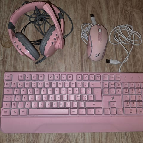 Kablet tastatur og mus sett i rosa farge. Tastaturet har fullt norsk tastaturoppsett med numerisk tastatur. Musen er kablet med flere knapper og rullehjul. Settet passer som tilleggsutstyr til stasjonær eller bærbar PC der man ønsker eksternt tastatur og mus i matchende design.