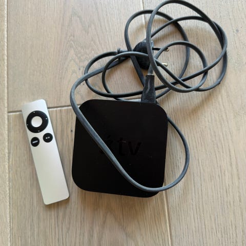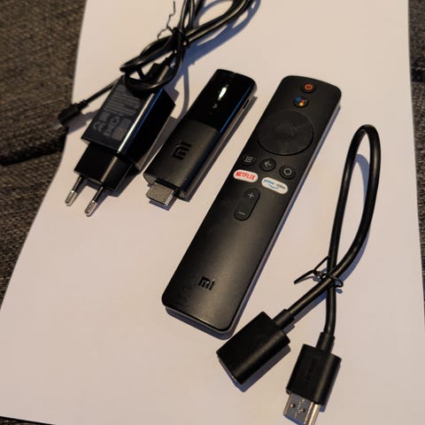 Xiaomi Mi Box TV-boks i svart farge (Mi Box S), 4K Ultra HD strømmemediespiller som kjører på Google TV (eller Android TV, avhengig av generasjon). Enheten kobles til TV via HDMI og strøm via medfølgende strømadapter. På bildene vises TV-boksen sammen med strømadapter og kabler. Egnet for strømming av digitalt innhold til TV, avhengig av hvilke funksjoner og apper som støttes av denne modellen.