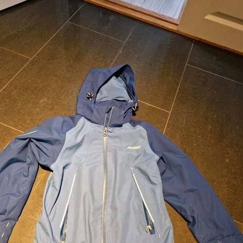 Bergans Sjoa youth Girl jakke i str 140. Blå. Pent brukt, men noe misfarging/litt grå på fremsiden. Synes ikke så godt, men prøvde å få frem på bildet.