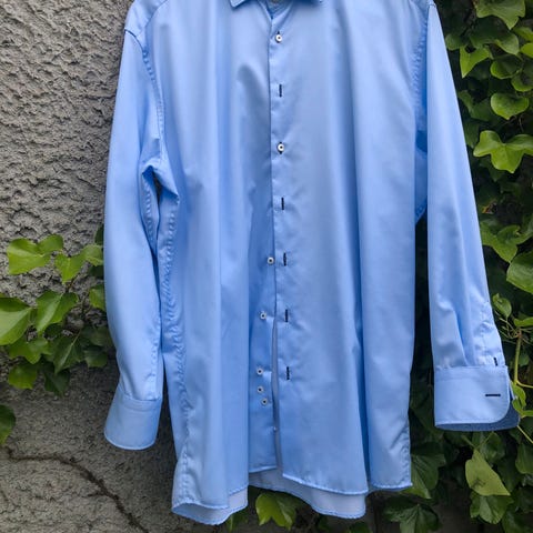 Thomas Pink skjorte for herre. Skjorten er blå og laget av bomull. Den har lange ermer, klassisk krage og knappelukking foran. Mansjettene har knapper, og innsiden av knappestolpen har et blomstermønstret stoffdetalj i kontrastfarger. Passer som pen- eller hverdagskjorte.