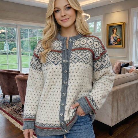 Perfekt som ulljakke, strikkejakke dame, retro genser, cottagecore stil, skandinavisk mote, varm vintergenser, håndlaget kvalitetsplagg.
