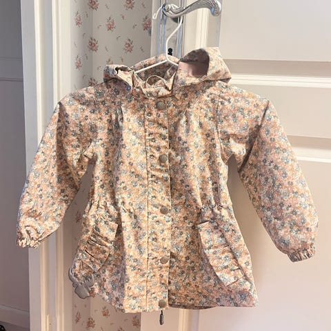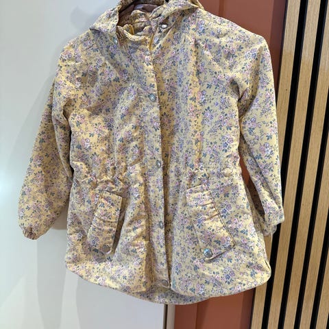 Wheat vårjakke til jente i størrelse 128. Jakken er laget i polyester og har et flerfarget blomsterprint. Den kan oppleves litt treg i glidelåsen, men barnet har ikke sagt noe, så går nok fint. Den ser veldig fin ut, men ser du nærme er det litt slitasje på enden av ermene(se bilde) og stroppa til å henge opp jakken er røket på den ene siden.