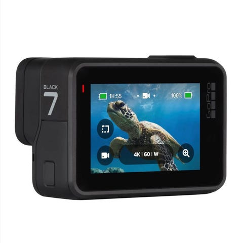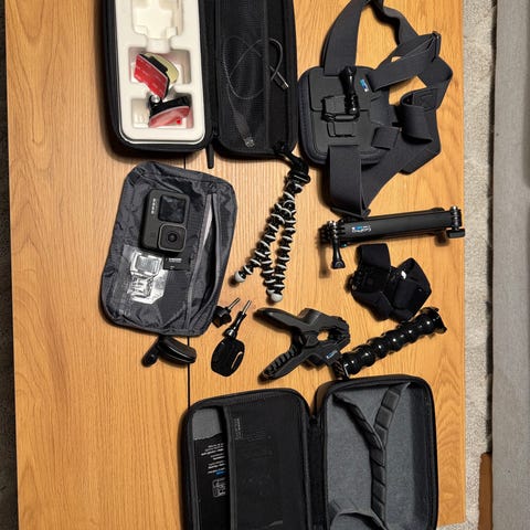 GoPro actionkamera med tilbehør og bæreveske. Settet inkluderer et GoPro-kamera, beskyttende etui, diverse kabler og fester organisert i en polstret veske. Egnet for bruk til opptak av video og bilder i ulike aktiviteter, som for eksempel tur, sport og reise. Flere monteringsløsninger og reimer gir mulighet for fleksibel plassering av kameraet under bruk.