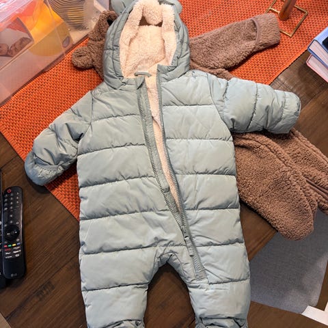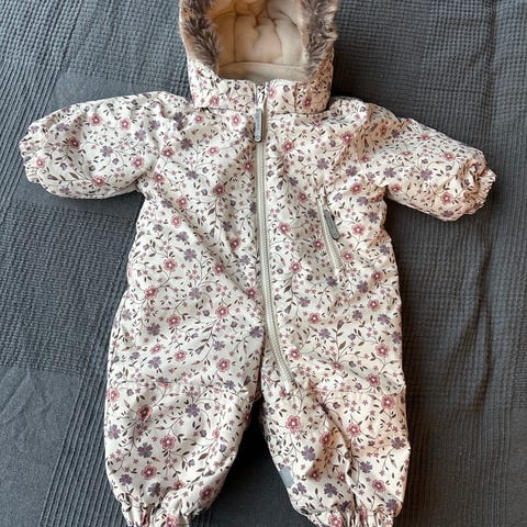 H&M kjeledress for barn i størrelse 68. Farge beige og laget i polyester. Modellen er polstret og har hette samt mykt, loddent fôr på innsiden for ekstra komfort. Glidelås foran gjør den enkel å ta av og på. Passer som yttertøy for baby/unisex i kjøligere vær.