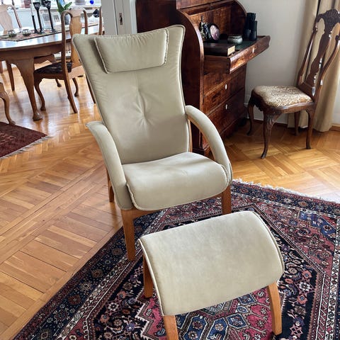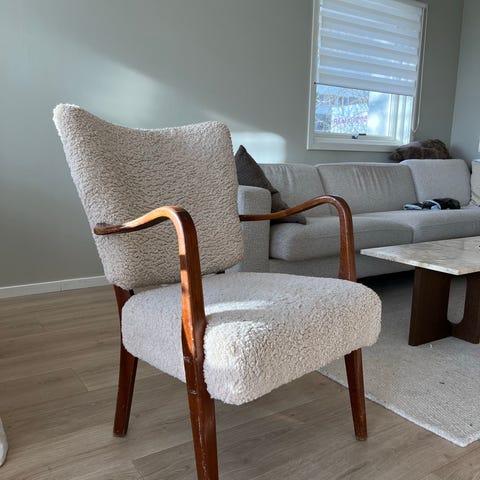 Nytrukket Epos lenestol fra Brunstad i modern buclestoff i offwhite. Treverket er pusset ned og behandlet med hvitolje. Stolen er i god stand og veldig behagelig å sitte i. 🤍