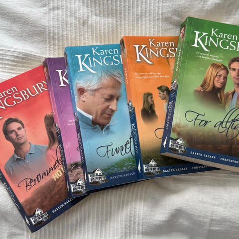 Selger bøker fra den populære kristne romanserien om Baxter-familien av Karen Kingsbury (skrevet sammen med Gary Smalley). Serien følger familien gjennom kjærlighet, kriser, tro og relasjoner, og er kjent for sterke følelser og et tydelig kristent livsperspektiv.