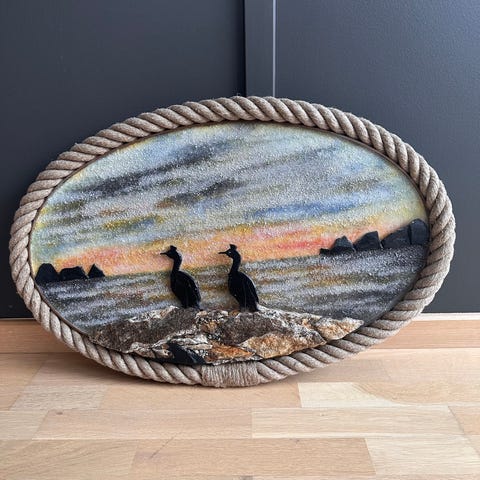Henrik V. Kirkesæthers veggbilde med motiv av to skarver på svaberg mot hav og solnedgang. Rundt bilde med kraftig tauverk som ramme. Baksiden har håndskrevet tekst om motivet og oppheng for veggmontering. Kunstverket er laget av stein og materialer fra Balsfjord, og er datert 23.01.97.