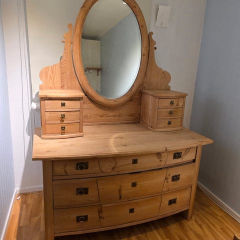 Kommode med speil i heltre furu. Møbelet har en bordplate med speil og to romslige skuffer under. Speilet er ovalt og festet til en ryggplate med utskårne detaljer. Passer som sminkebord eller kommode på soverom eller i gang. Utført i ubehandlet furu som gir et naturlig uttrykk.