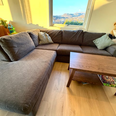 Selges hjørnesofa på grunn av flytting . Denne sofaen gjøres raskt og enkelt om til ei romslig seng, og gjør stua om til et soverom. Oppbevaringen under setet er lett å komme til og har plass til sengetøy eller puter.