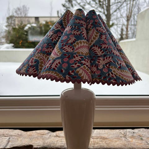 Nydelig hvit keramikklampe med håndlaget skjerm i stoff fra Studio Bazar