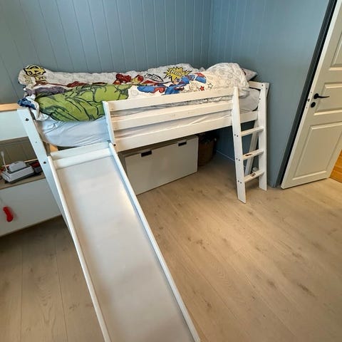 En helt super seng på et lite barnerom, siden den frigjør gulvplass - akkurat det barnet trenger for å kunne leke! Og under sengen kan du skape en herlig oase for barnet ditt - her er det bare fantasien som setter stopper.