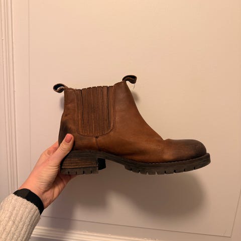 Shearersugg ankelstøvletter med kilehæl i størrelse 39. Støvlettene er laget i semsket materiale i brun farge med lys, myk fôret kant øverst. De har dekorativ metalllenke og spenne på utsiden. Sålen er hel med kilehæl som gir ekstra høyde og stabilitet. Passer som varme og komfortable høst- og vinterstøvletter til hverdagsbruk.