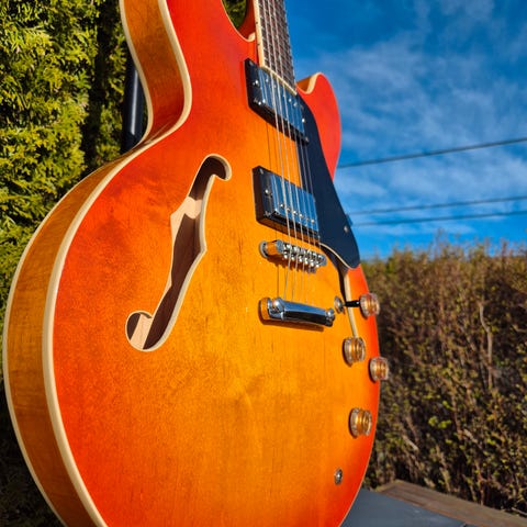 Halvakustisk gitar i rød finish. Kroppen har hul konstruksjon med to f-hull og doble humbucker-pickuper. Gitaren har fast stol og metallbro, samt volum- og tonekontroller. Leveres med et hardt etui fra Gator Cases, tilpasset halvakustisk gitar.