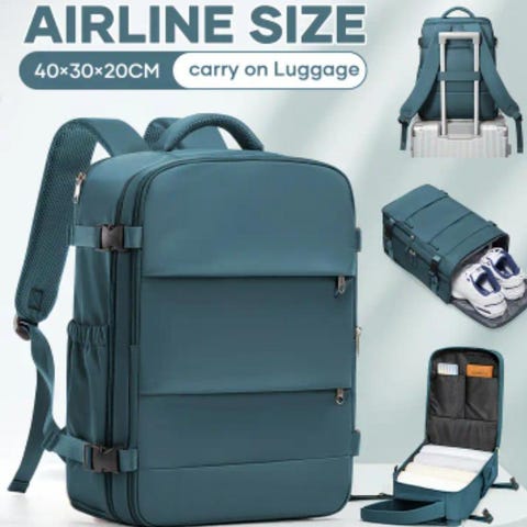 Veldig praktisk sekk, rommer mye. Har stropp bak til å feste over håndtaket på kofferten. Mange praktiske lommer til oppbevaring